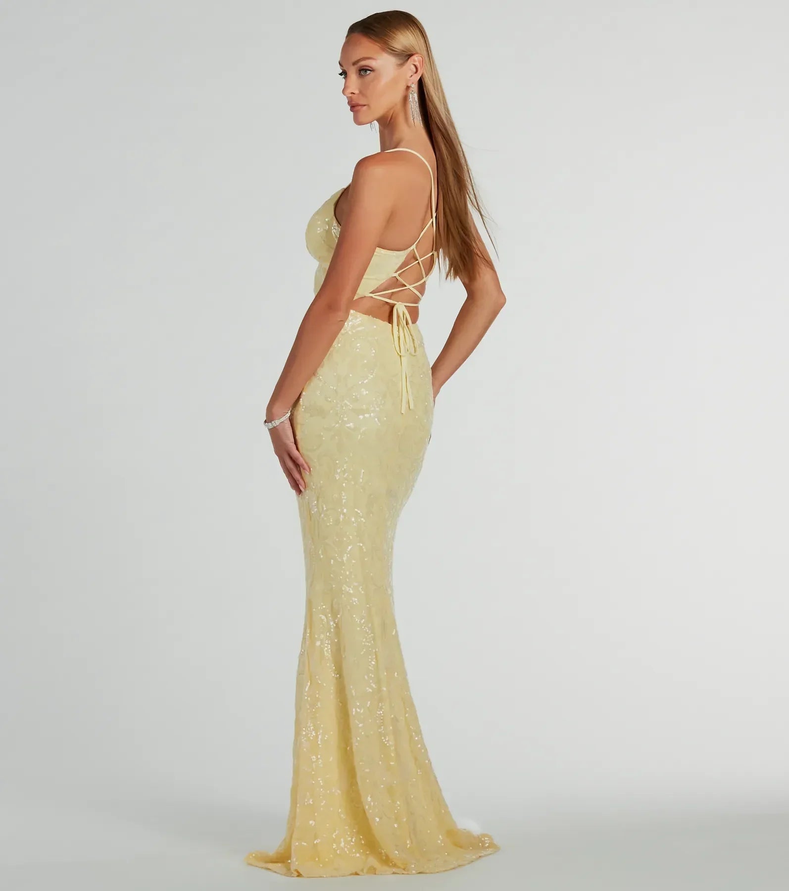 Embellished with light-catching sequins, the Bethanie formal dress is a clear stunner for prom or red-carpet events! She features a sleeveless V-neckline with a padded bust eliminating the need for a bra, spaghetti straps, a lace-up back, and a flattering mermaid silhouette with a floor-length hem. The formal dress is composed of a sequin-scroll pattern on mesh fabric with a stretchy knit lining. Complete your dressy look with for extra glimmer!