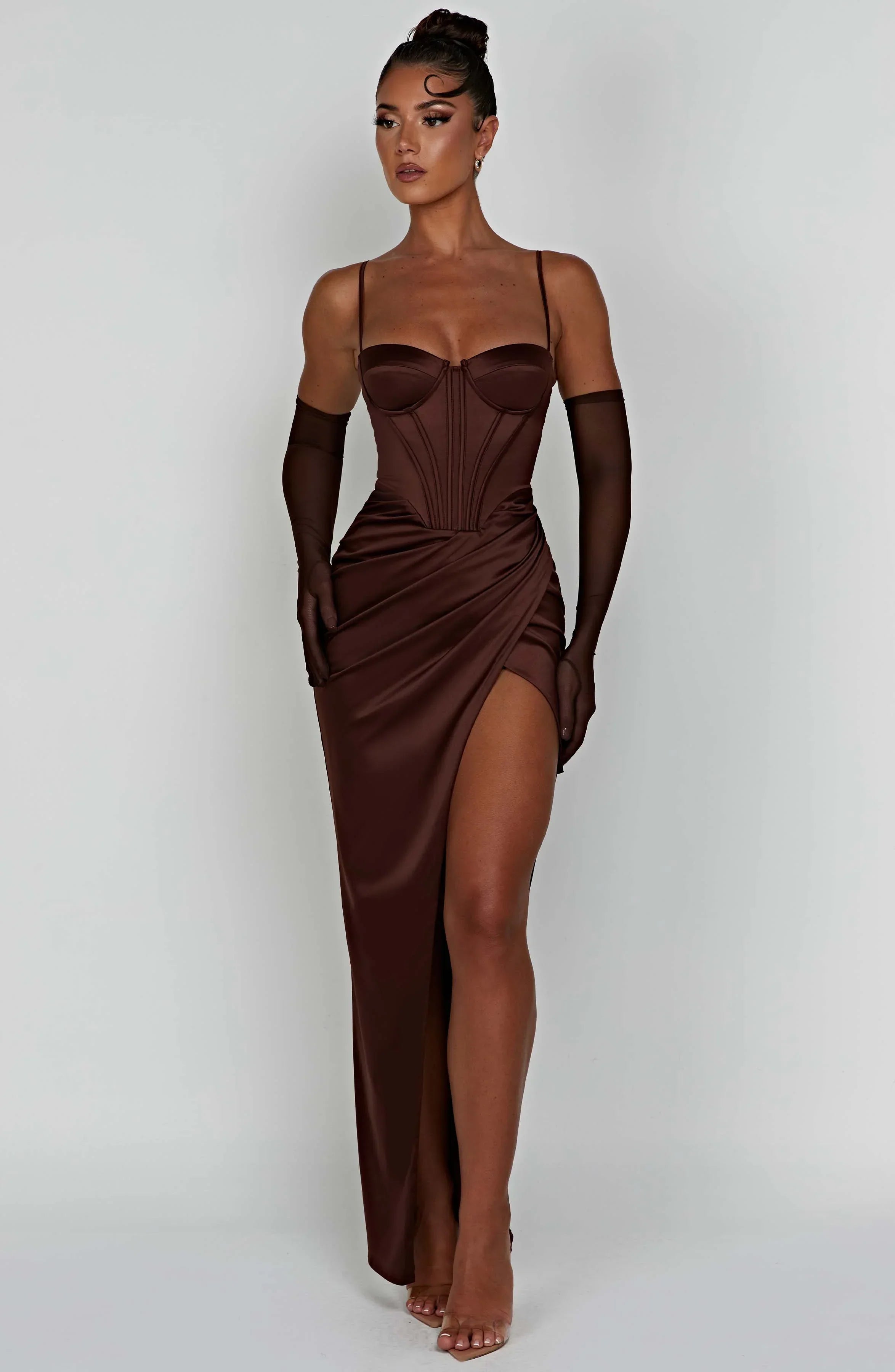 All attention, on you. The Despina maxi is a stunning choice for balls, formals, weddings and proms this season. Cut from luxury heavy satin with a stretch to skim over curves, this dreamy design is complete with a corset waist, thigh split, drape detail and underwired cups to lift and frame the bust. Style with glam waves and platforms.