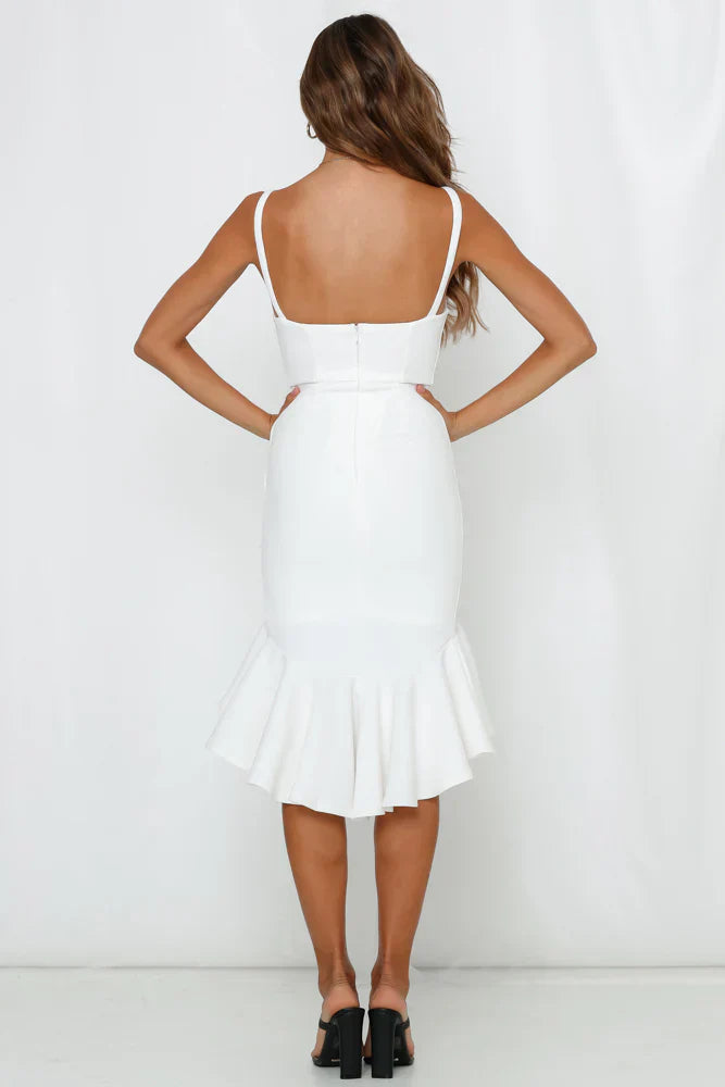 Go mega glam girl in our Hard To Be Cool Midi Dress. This super cute style features a asymmetrical ruffle hemline, straight neckline, thin tubular should straps and a zipper through the back.